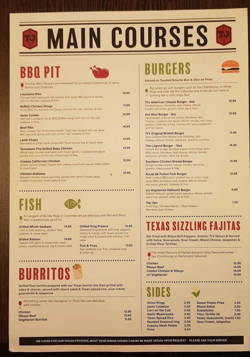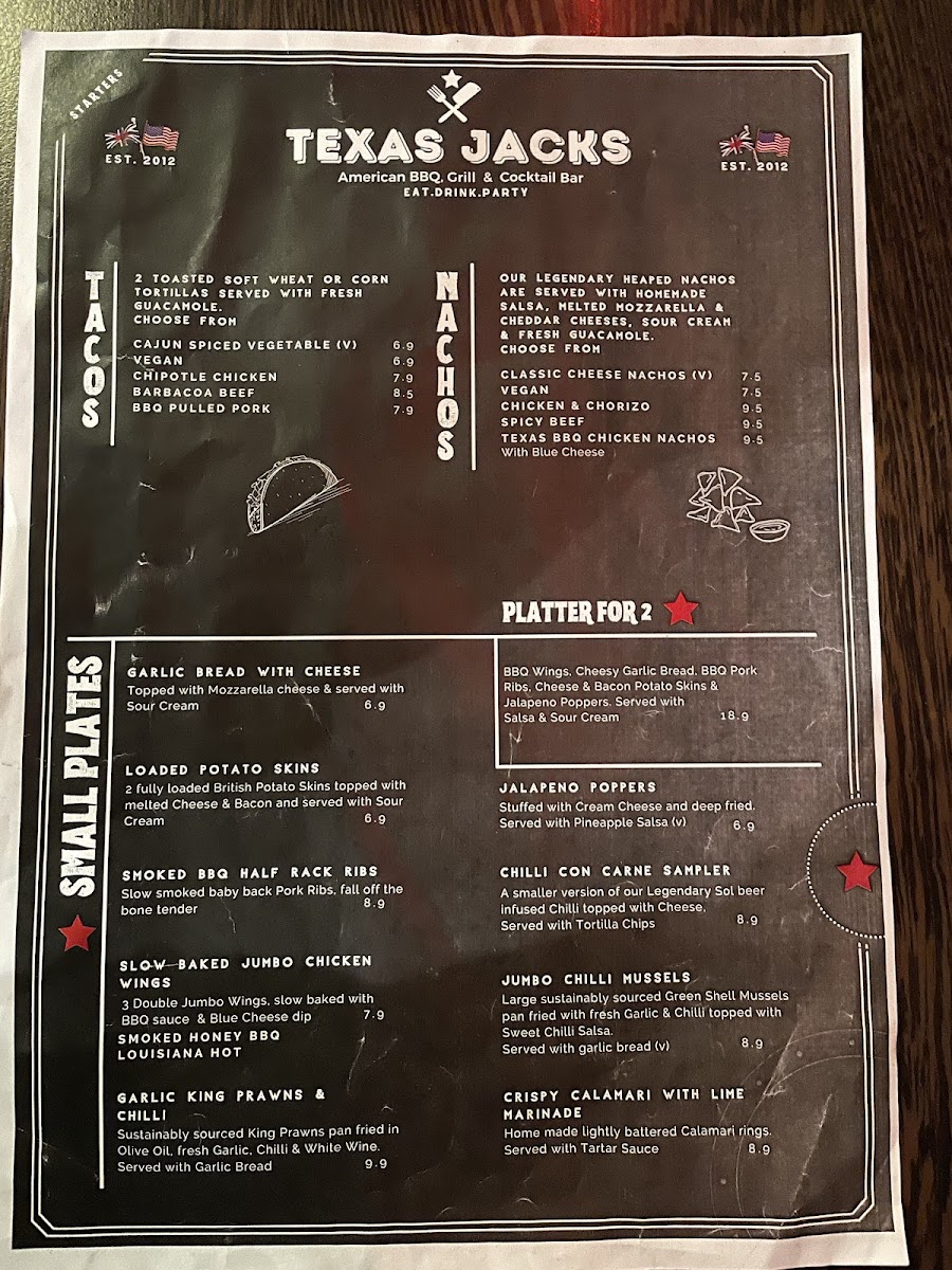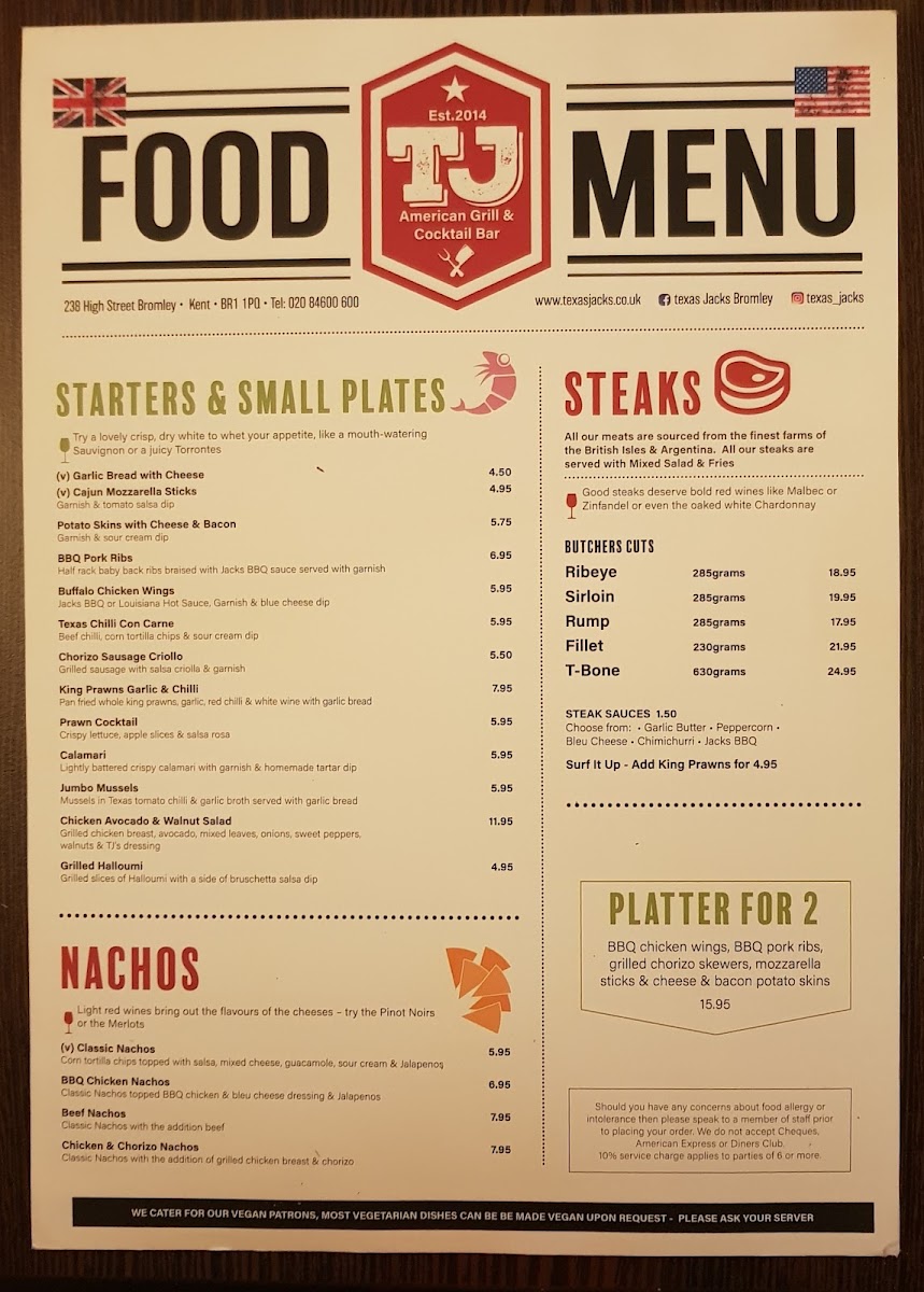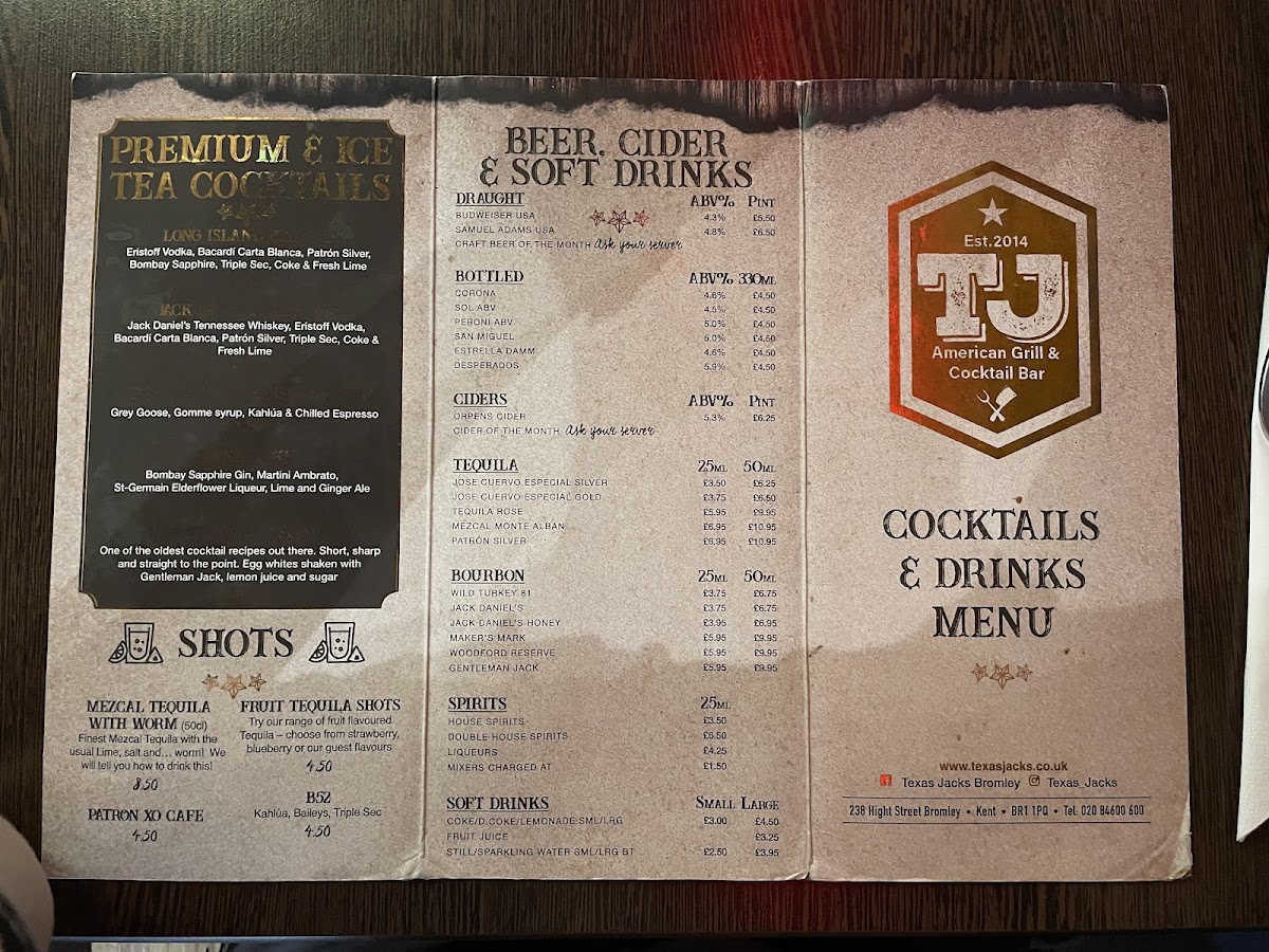 Welcome to Texas Jacks, a culinary gem located at 238 High St, Bromley. This vibrant eatery specializes in premium butcher's cuts, including ribeye, sirloin, and T-bone, ensuring meat lovers are in for a treat. The menu also boasts a tantalizing selection of ice tea cocktails, featuring their signature Jack Fruit Tequila Shots, alongside classic soft drinks and refreshing fruit juices.